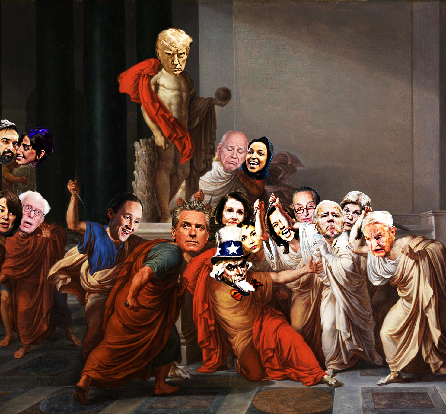 Front Row; Left to Right: Minnesota Senator Amy Klobuchar; Vermont Senator Bernie Sanders; Seattle Mayor Katie Wilson; California Governor Gavin Newsom; United States (U.S.) - Uncle Sam (Uncle Sugar to Some); Ex-House Speaker California Rep. Nancy Pelosi; New York's 14th Congressional District Rep. Alexandria Ocasio-Cortez (AOC); Ex-Vice President Kamala Harris; Senate Minority Leader Chuck Schumer; Ex-President Joe Biden; Massachusetts Senator Elizabeth Warren; Hungarian-American George Soros known as “The Man Who Broke The Bank of England” as a result of his short sale of US$10 billion worth of pounds sterling, which made him a profit of $1 billion, during the 1992 Black Wednesday UK currency crisis