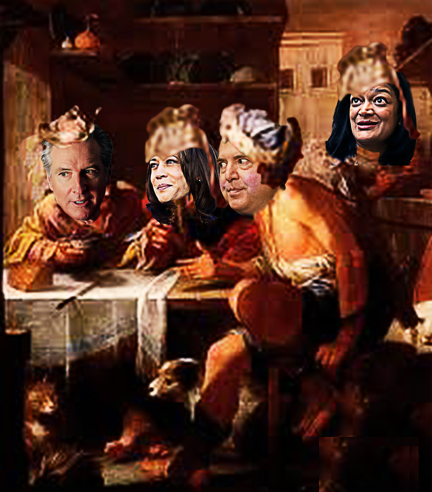 Left to Right: California Governor Gavin Newsom; Ex-Vice President Kamala Harris; California Senator Adam Schiff; California Congresswoman Pramila Jayapal